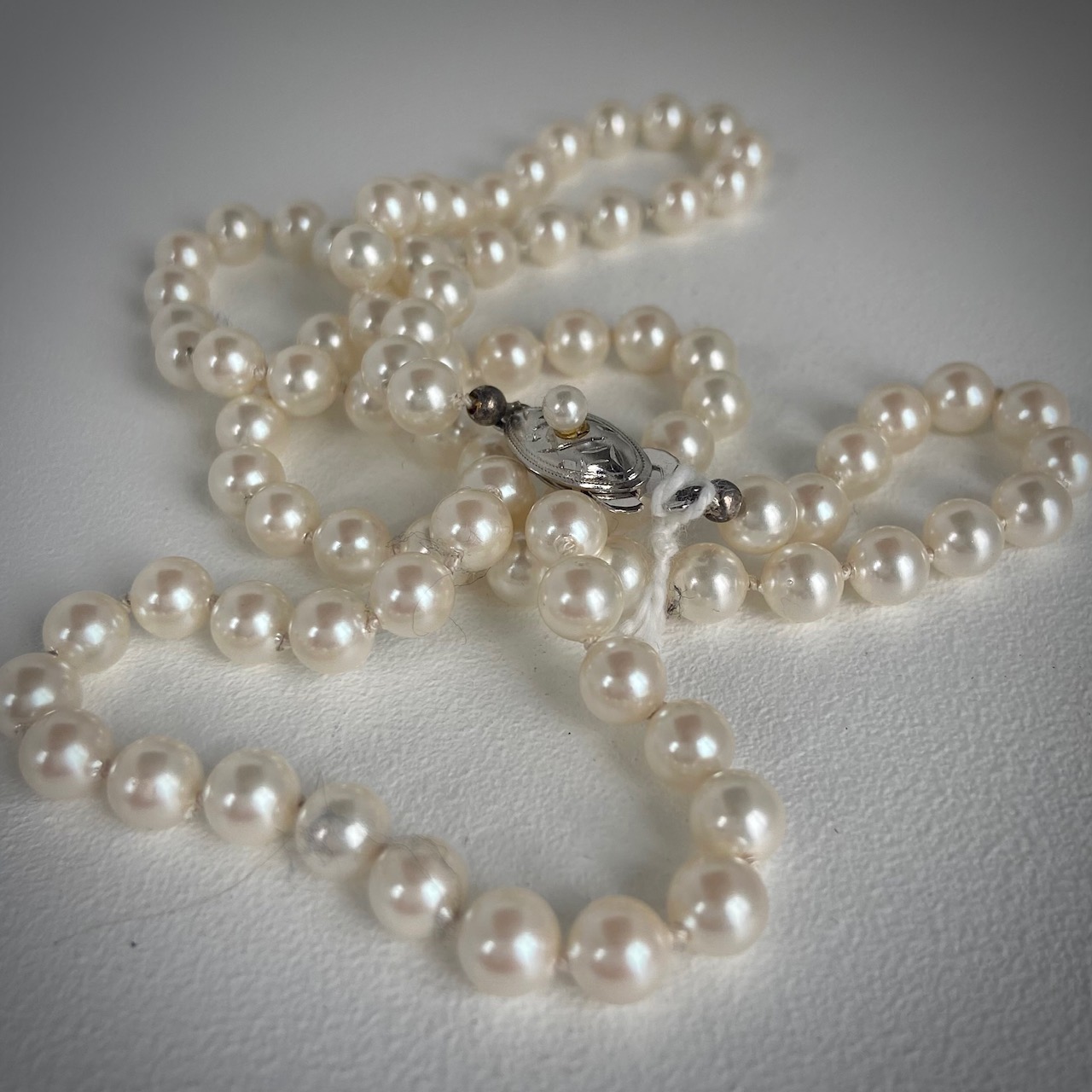 Pärlhalsband, långt. Benvitt. Äldre knäppe.