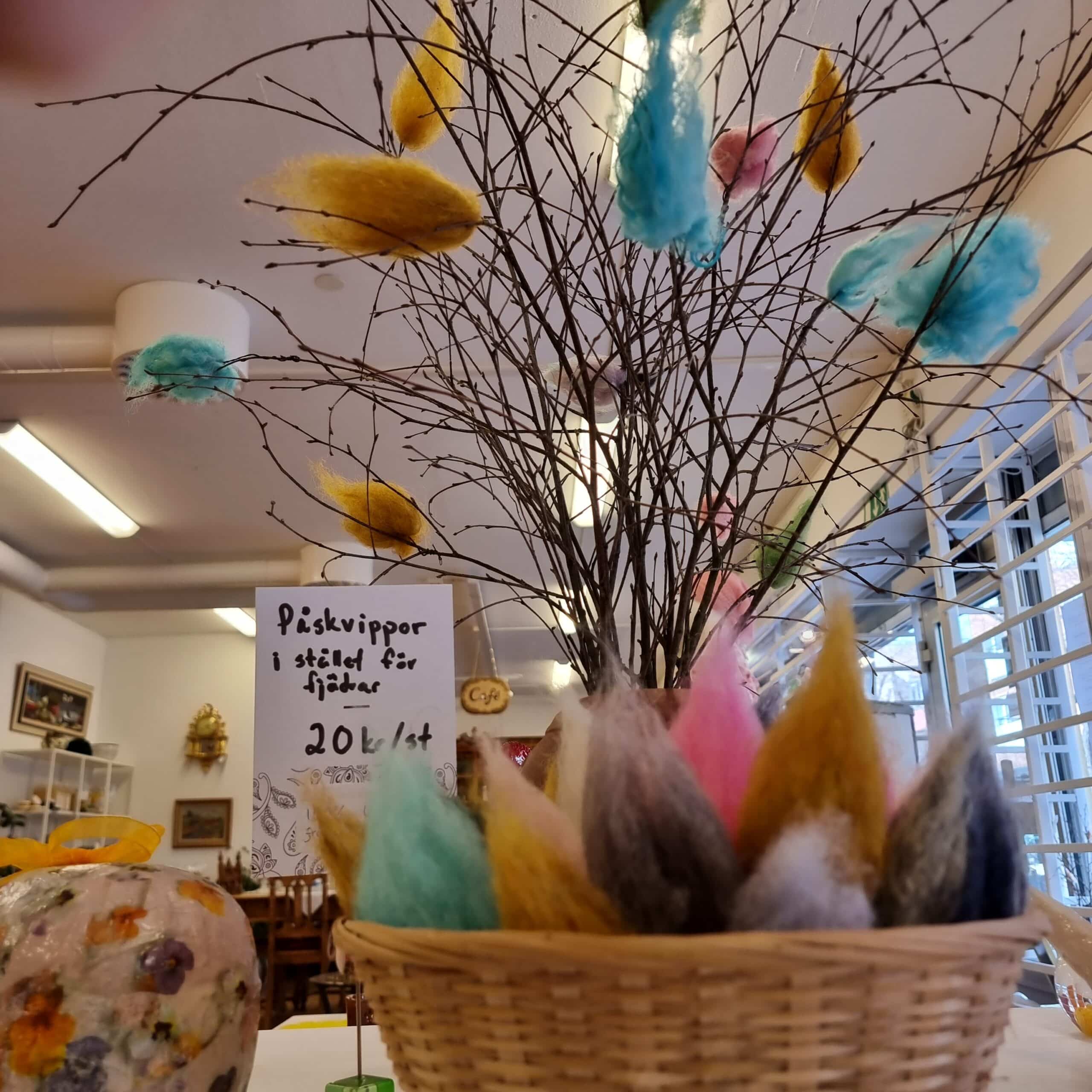 Ett djur- och miljövänligt alternativ till påskfjädrar är våra fina påskvippor av ull. De är gjorde av närproducerad ull och handtovade av oss som jobbar på Sallys – en reko affär.