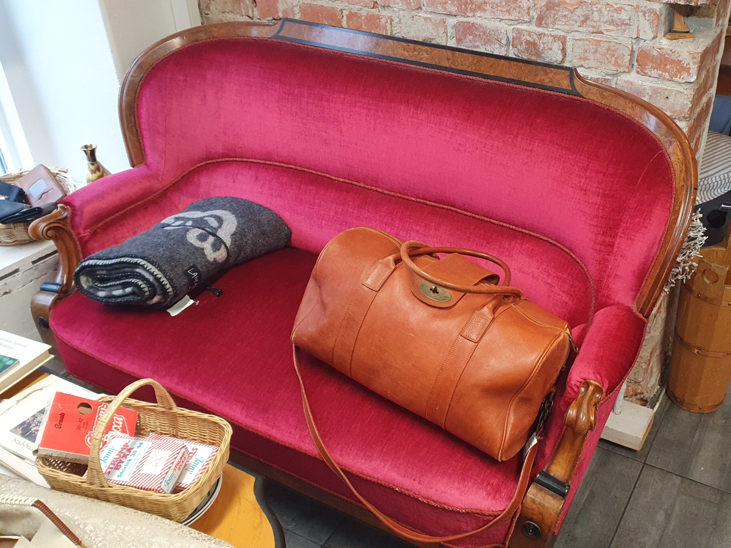 Nätt, tvåsitsig sammetssoffa i vinröd sammet och snidat trä. Vintage