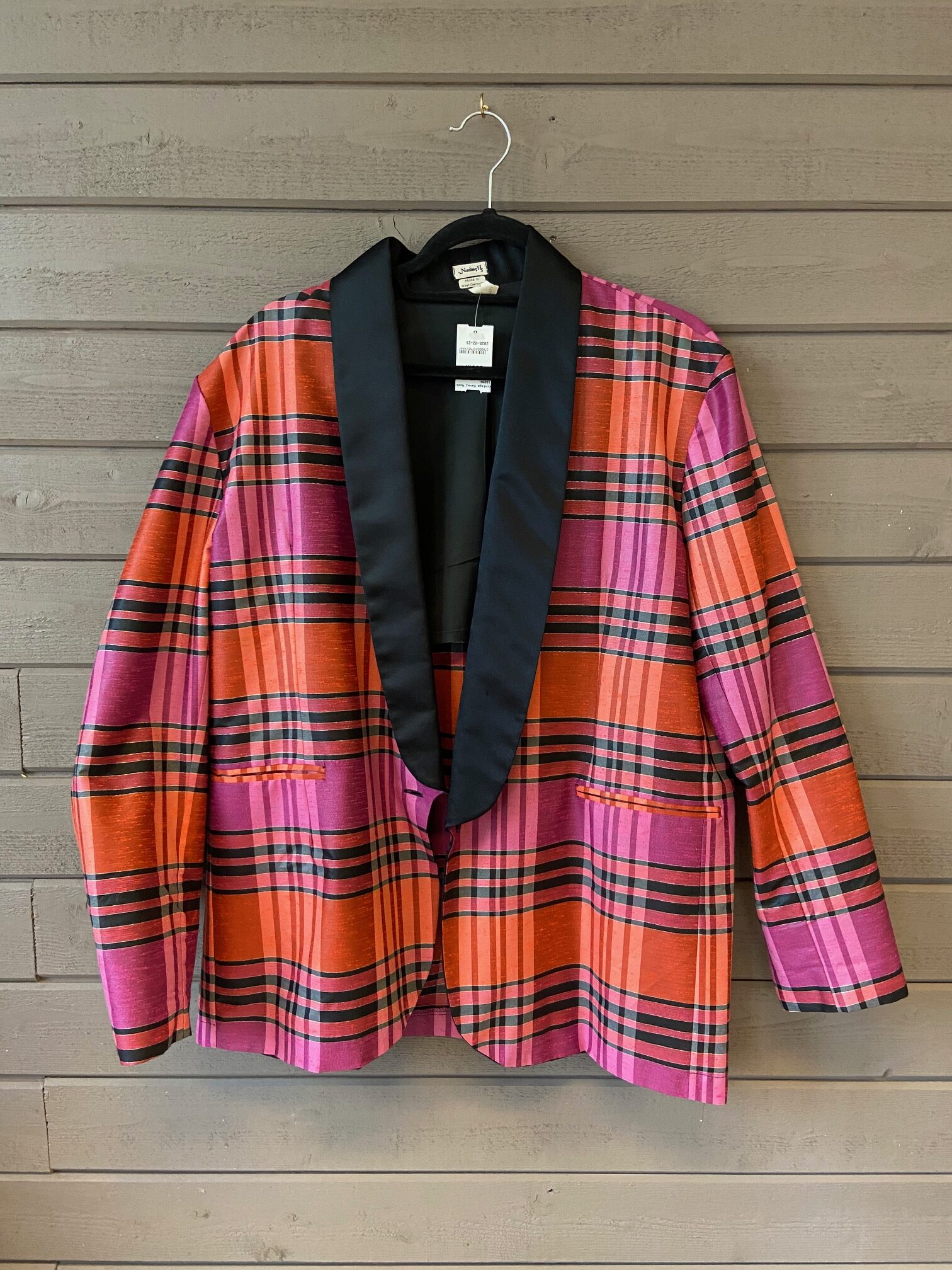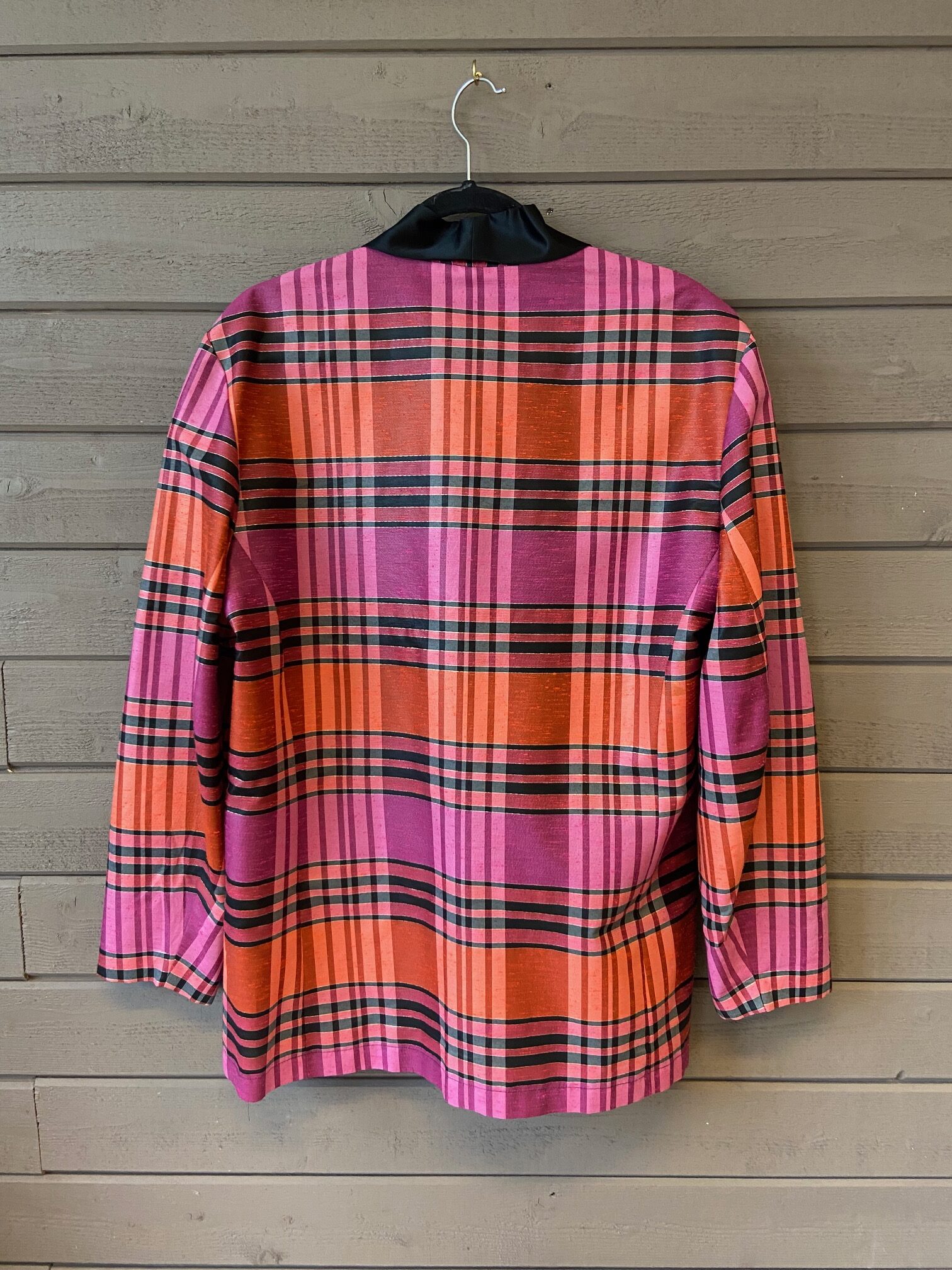 Rosa röd rutig med svart silkeliknande krage.